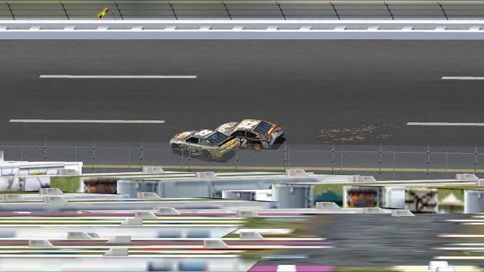 Coming to the line, I was running really close with Jimmie Johnson when I got a little wiggle off the tri-oval which barely put me into his rear panel. Miraculously, he only scraped the wall and was completely missed by all the other drivers.
