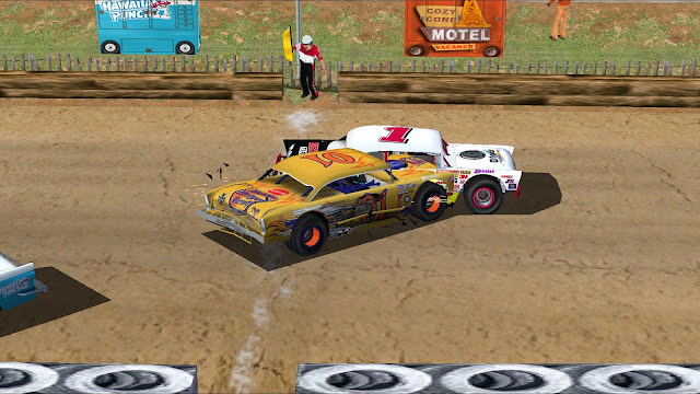 Darrel came up on the wreck quickly and smashed the 27 of Lightning McQueen into the tire wall while Sandy had to take evasive action.